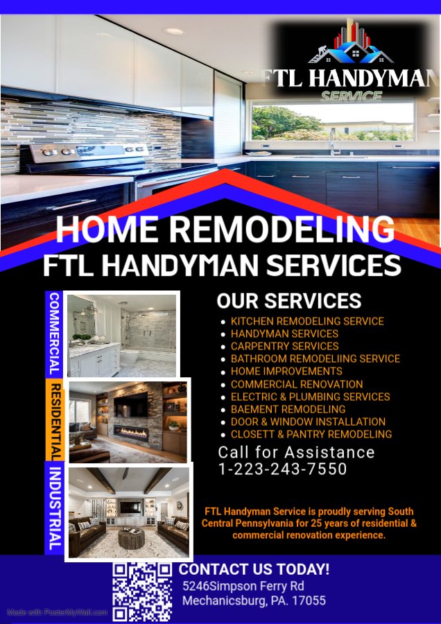 Looking for a skilled handyman? FTL Handyman Services of South Central PA has you covered! As a licensed Home Improvement Contractor, we specialize in residential and commercial handyman services, home improvements, carpentry, remodeling, and renovations. Based in Mechanicsburg, PA, we’re your go-to team for reliable and experienced home improvement work. From installing lighting fixtures and crown molding to drywall repairs and furniture servicing, we handle it all. Our mission is to make your home safer, more comfortable, and feel brand new. Contact us today to learn more or request a job!