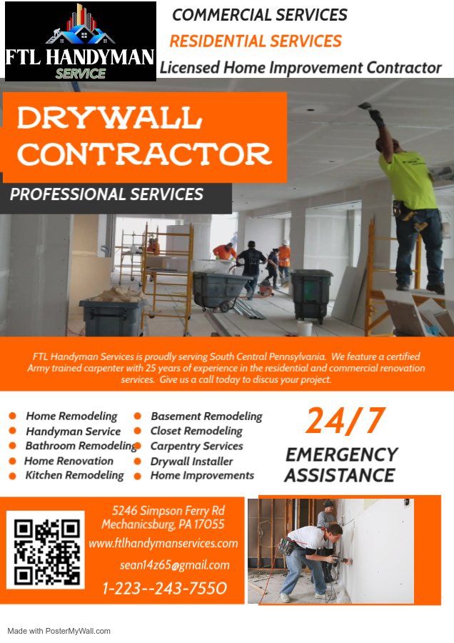 If you’re looking for a reliable and experienced drywall installation contractor or home improvement professionals around Mechanicsburg, PA, look no further than FTL Handyman Service of South Central PA. Our comprehensive handyman services are designed to ensure your home looks and feel brand new