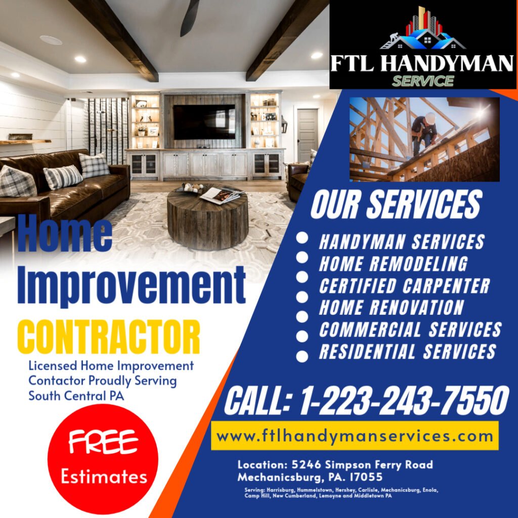 If you’re looking for a reliable licensed home improvement contractor in South Central PA, you’re in the right place. Our team of experienced professionals offers top-quality handyman services in Mechanicsburg, PA, and nearby areas. Whether it’s minor repairs or major home improvement projects, our services cover everything you need. We take great pride in our craftsmanship and customer satisfaction, making us the trusted choice for homeowners in Central PA seeking skilled and dependable professionals. Contact us today for all your handyman needs in Mechanicsburg, PA, and let us help you enhance your home. Over the years, I’ve worked with many handymen, but FTL Handyman Services truly stands out as a leader in the industry.