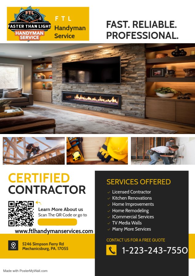 FTL Handyman Services of South Central PA is a licensed home improvement contractor offering top-notch services in Mechanicsburg, PA, and the surrounding areas. We specialize in TV media wall construction, electric fireplace installation, and basement renovations. Our accent walls are tailored to match each homeowner’s style and budget. We also provide residential and commercial handyman services, home improvements, carpentry, remodeling, and renovations. From installing lighting fixtures and crown molding to drywall repairs and furniture servicing, we’ve got you covered. Our mission is to make your home safer, more comfortable, and feel brand new. Request a job today to learn more about our reliable and experienced services.